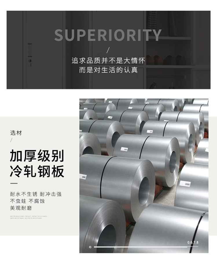 采用优质冷轧钢板经剪切,冲压,折弯,焊接,装配等九工位精制而成 采用自动喷淋式磷化 粉末静电喷涂,涂膜不易脱落,环保耐用,无毒害,无气味,光洁美观 外观精美,安全系数良好 坚固耐用,承受力强,可存放大量文件资料不变形