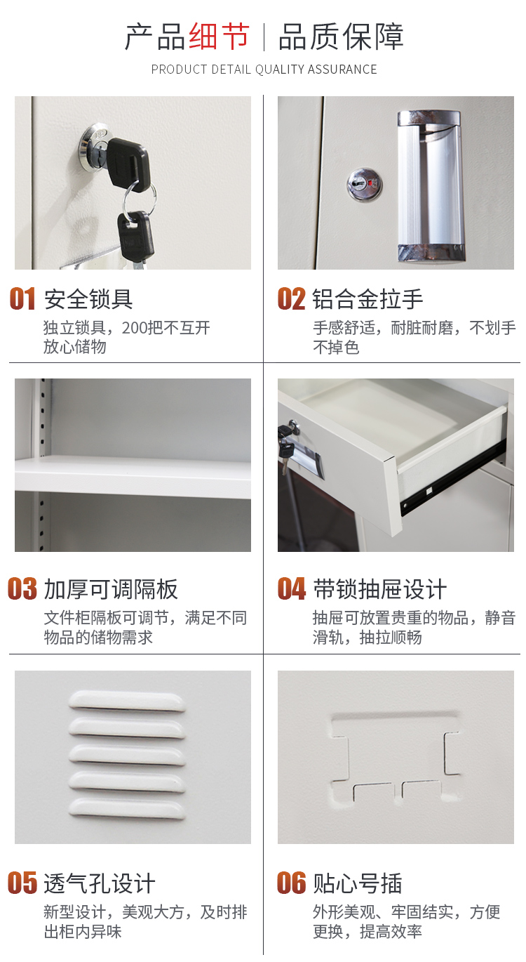 采用优质冷轧钢板经剪切,冲压,折弯,焊接,装配等九工位精制而成 采用自动喷淋式磷化 粉末静电喷涂,涂膜不易脱落,环保耐用,无毒害,无气味,光洁美观 外观精美,安全系数良好 坚固耐用,承受力强,可存放大量文件资料不变形